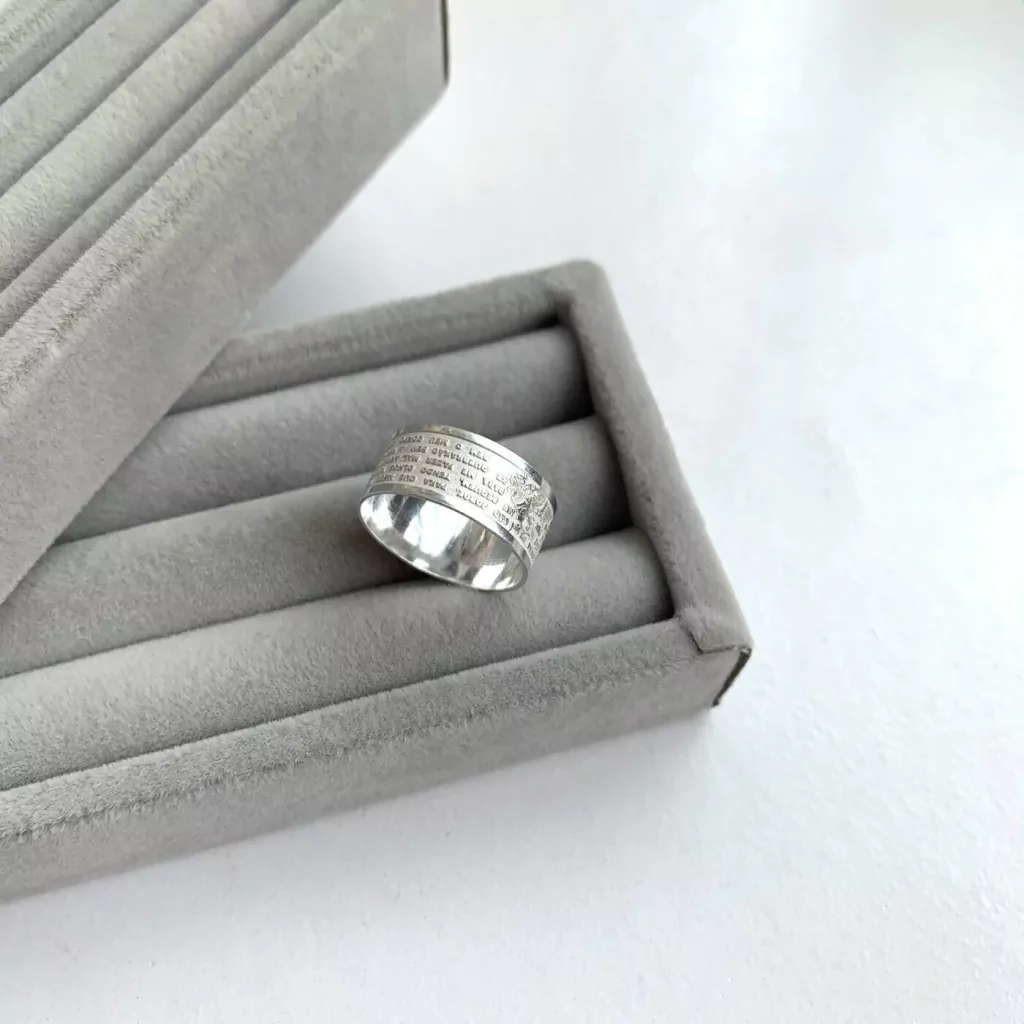 Anel largo com expessura aproximada de 10mm. Possui a gravação externa da imagem clássica de São Jorge e um trecho da sua oração: